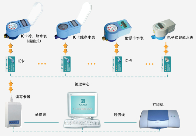 本系統(tǒng)由智能水表、IC卡、讀寫(xiě)卡器、管理軟件四部分組成,系統(tǒng)架構(gòu)圖如下: