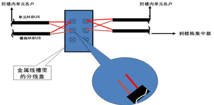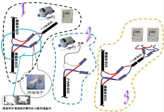 ? 表具通信總線連接時(shí)應(yīng)將表具通信線纏繞在總線干線上并用閉端端子套緊壓牢。現(xiàn)場(chǎng)可根據(jù)情況將此節(jié)點(diǎn)放在接線盒內(nèi)或三通/四通盒內(nèi),以便后期維護(hù)。